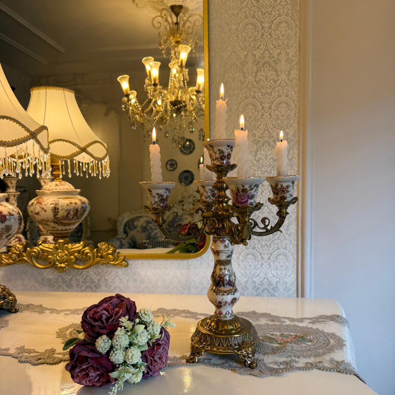 DESCRIPTION: An embodiment of European opulence, this five-arm candelabra is crafted from premium ceramic and enriched with ornate metal detailing inspired by Victorian artistry. Designed as a sculptural centerpiece rather than only a functional object, it reflects heritage craftsmanship and aristocratic taste, making it ideal for dining tables, consoles, and formal settings.