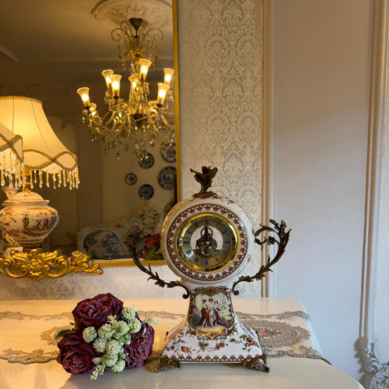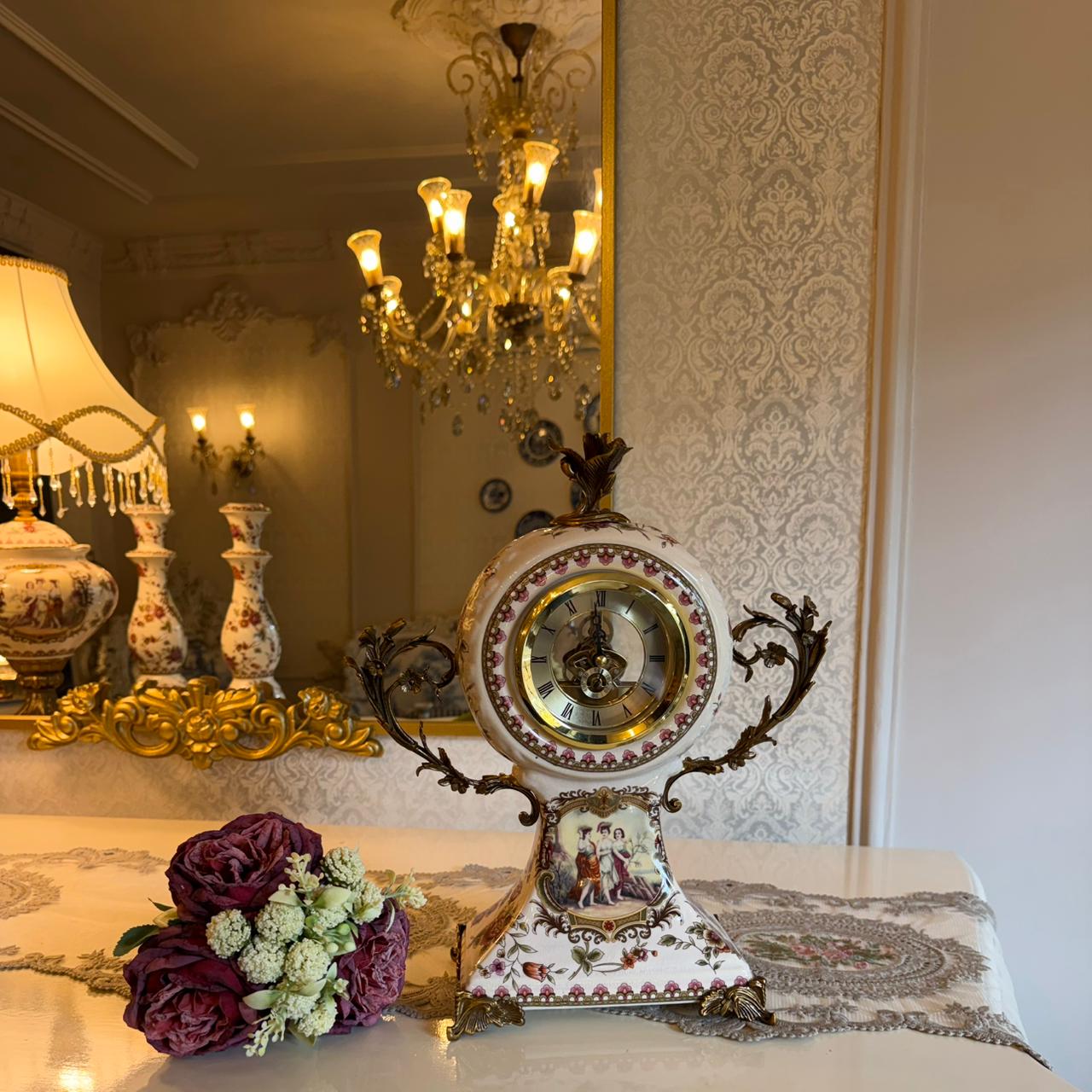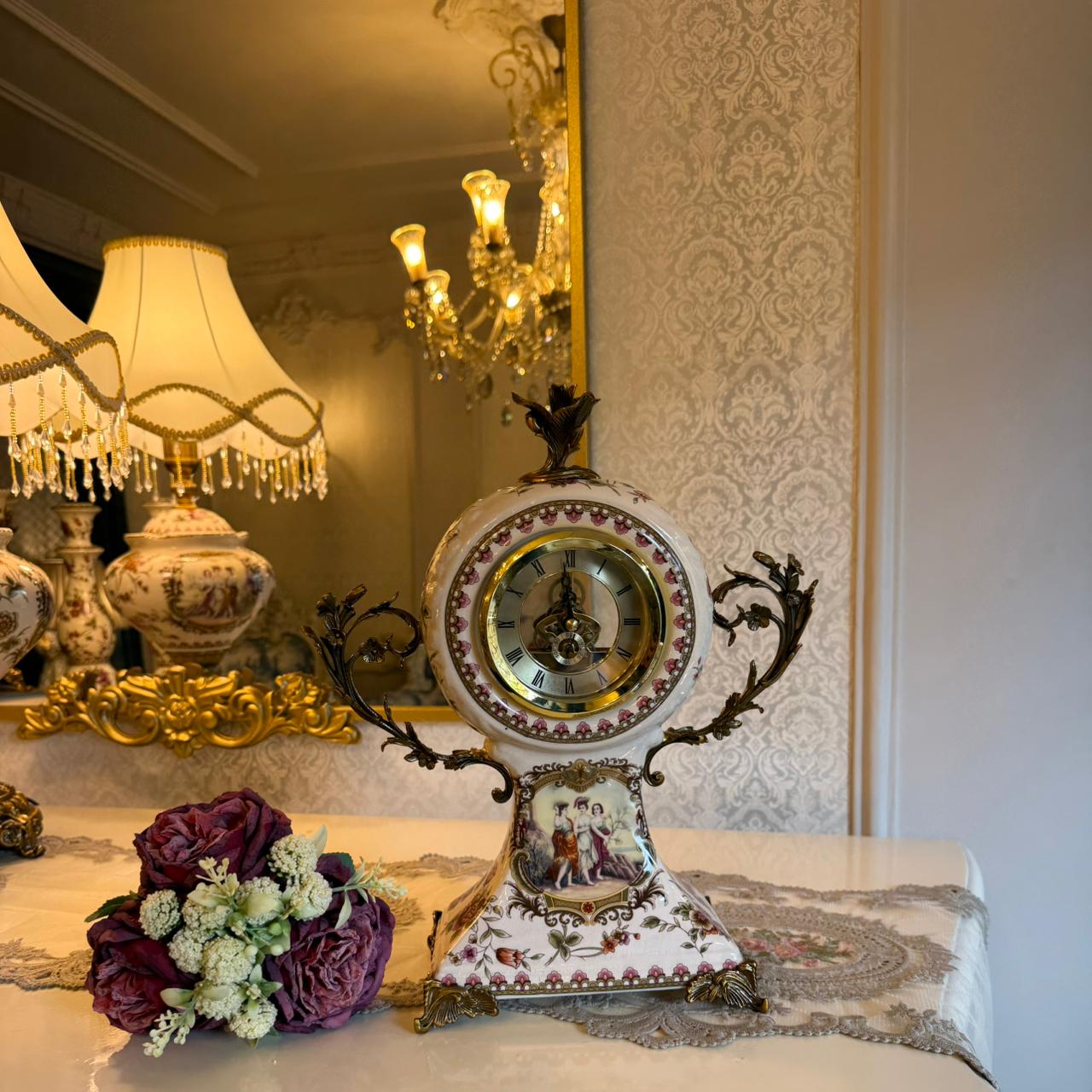 DESCRIPTION: A distinguished blend of function and heritage elegance, this table clock is crafted from high-quality ceramic and adorned with refined metal detailing inspired by Victorian ornamentation. Designed as both a timepiece and decorative heirloom-style accent, it adds prestige and cultured charm to desks, consoles, and mantel displays.