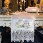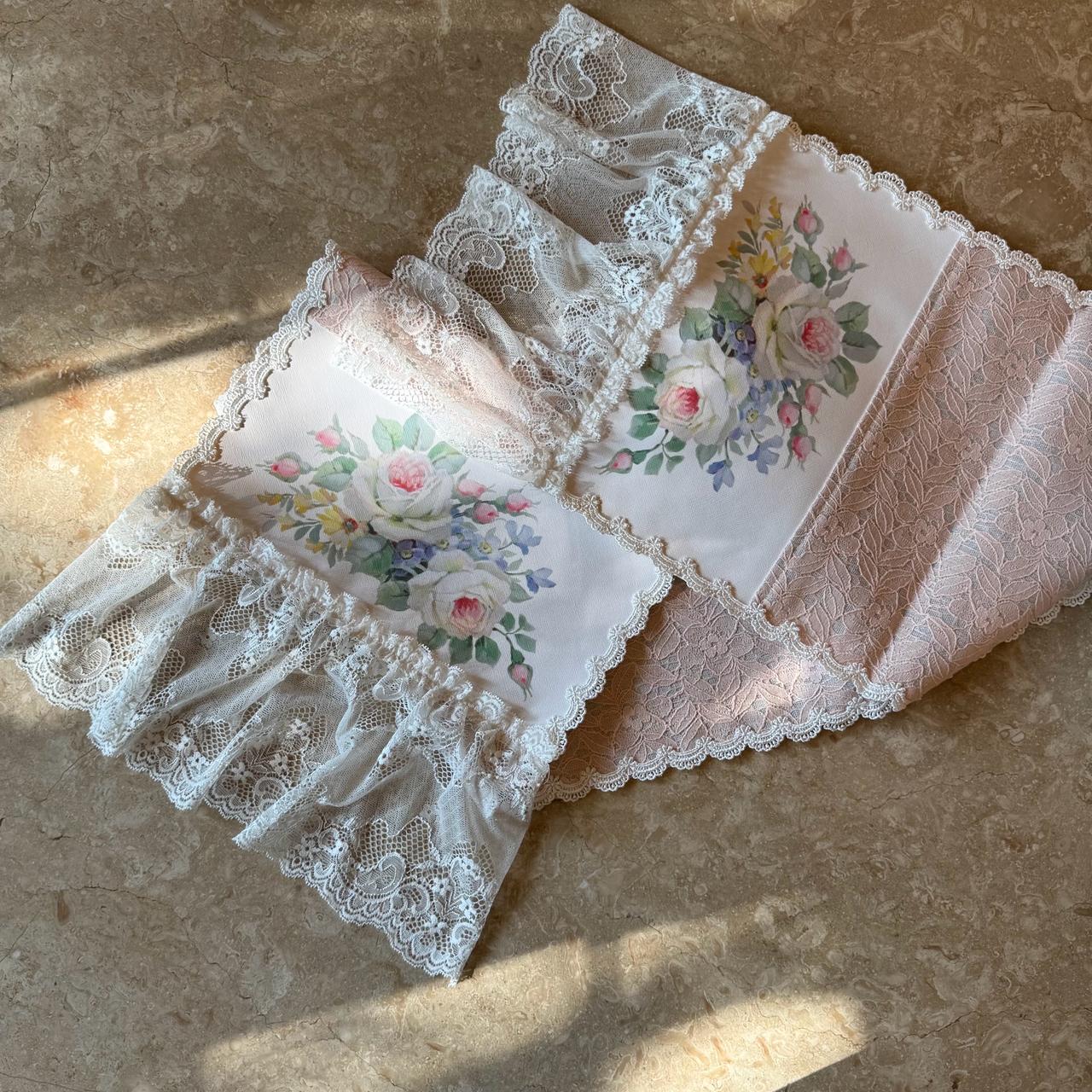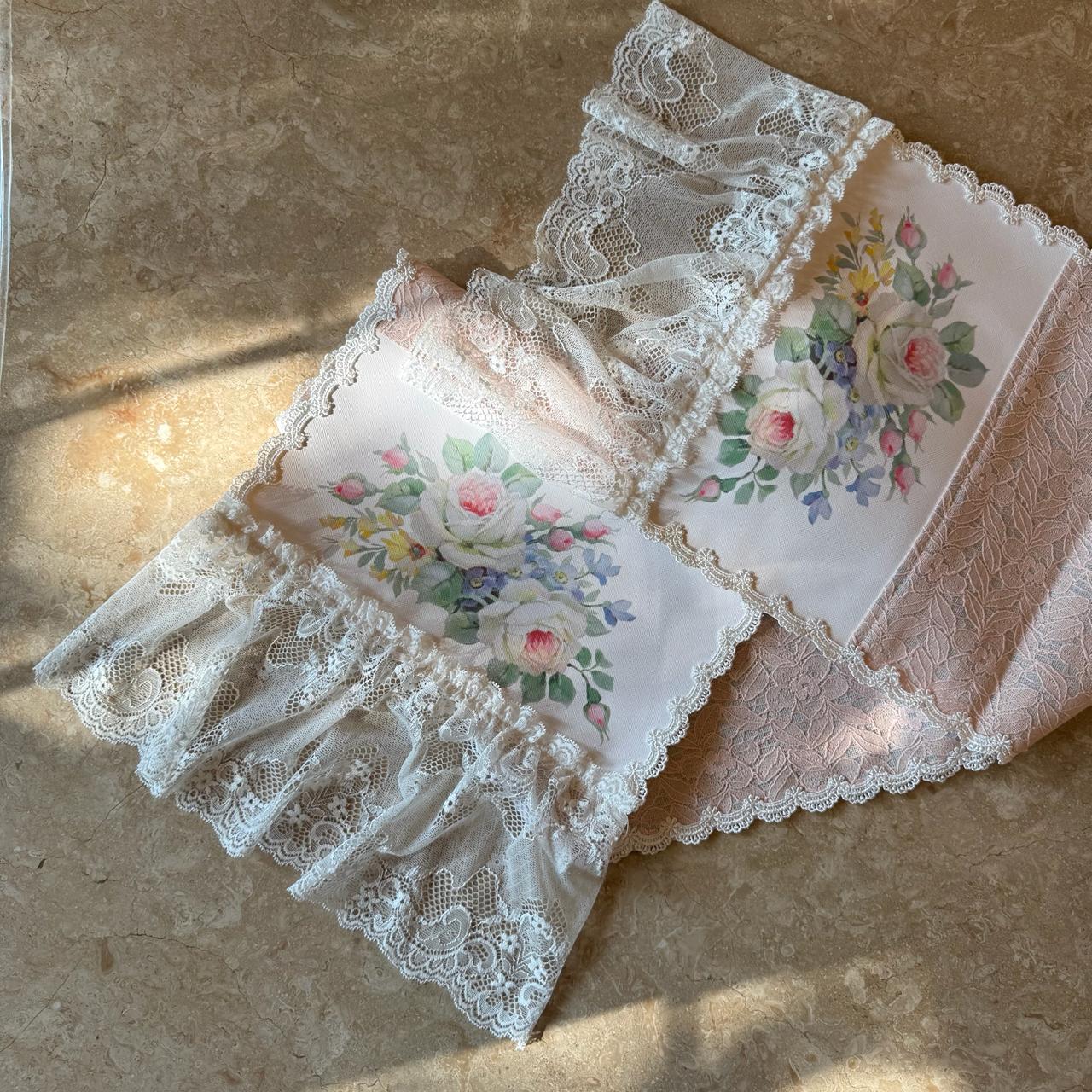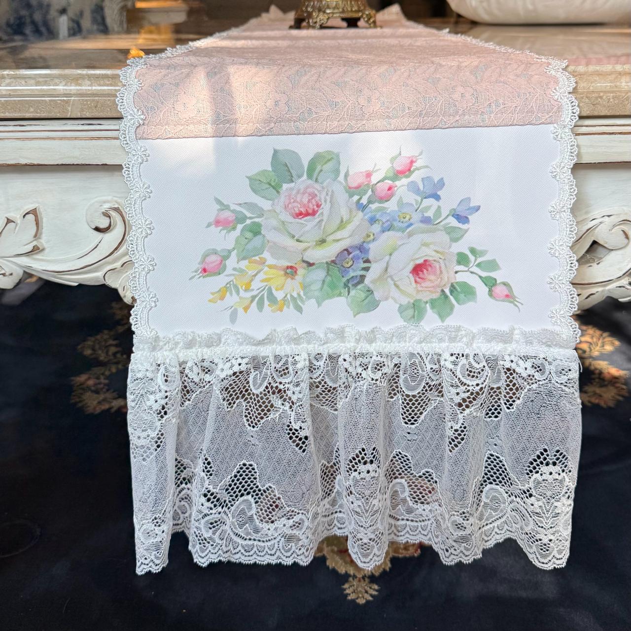 DESCRIPTION: Antoinette Rose Runner brings vintage charm to your table with its blush pink base, delicate old rose design, and ruffled lace edging on both ends. Inspired by classic European décor, it adds a soft, graceful statement to everyday meals and special gatherings alike.