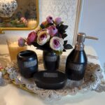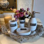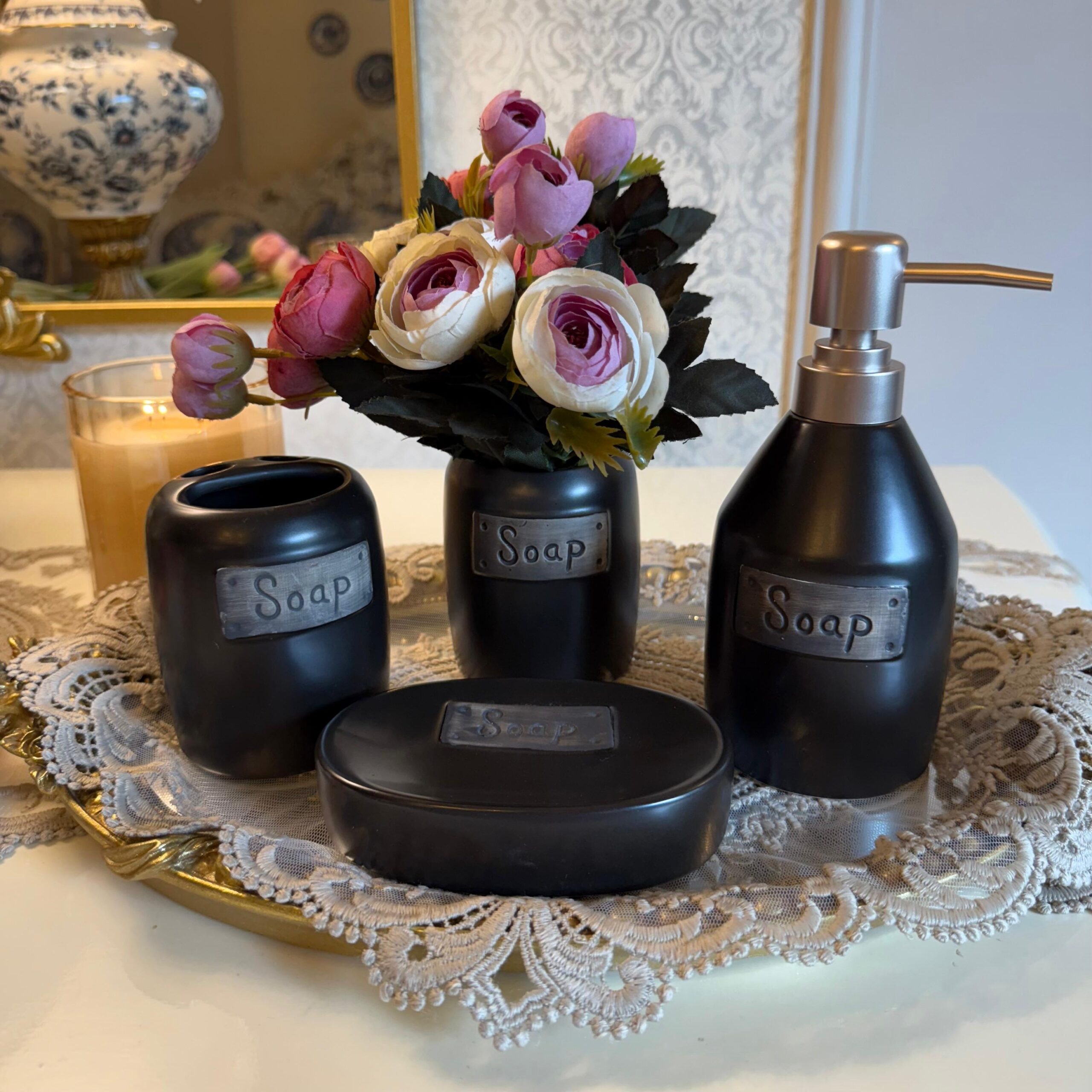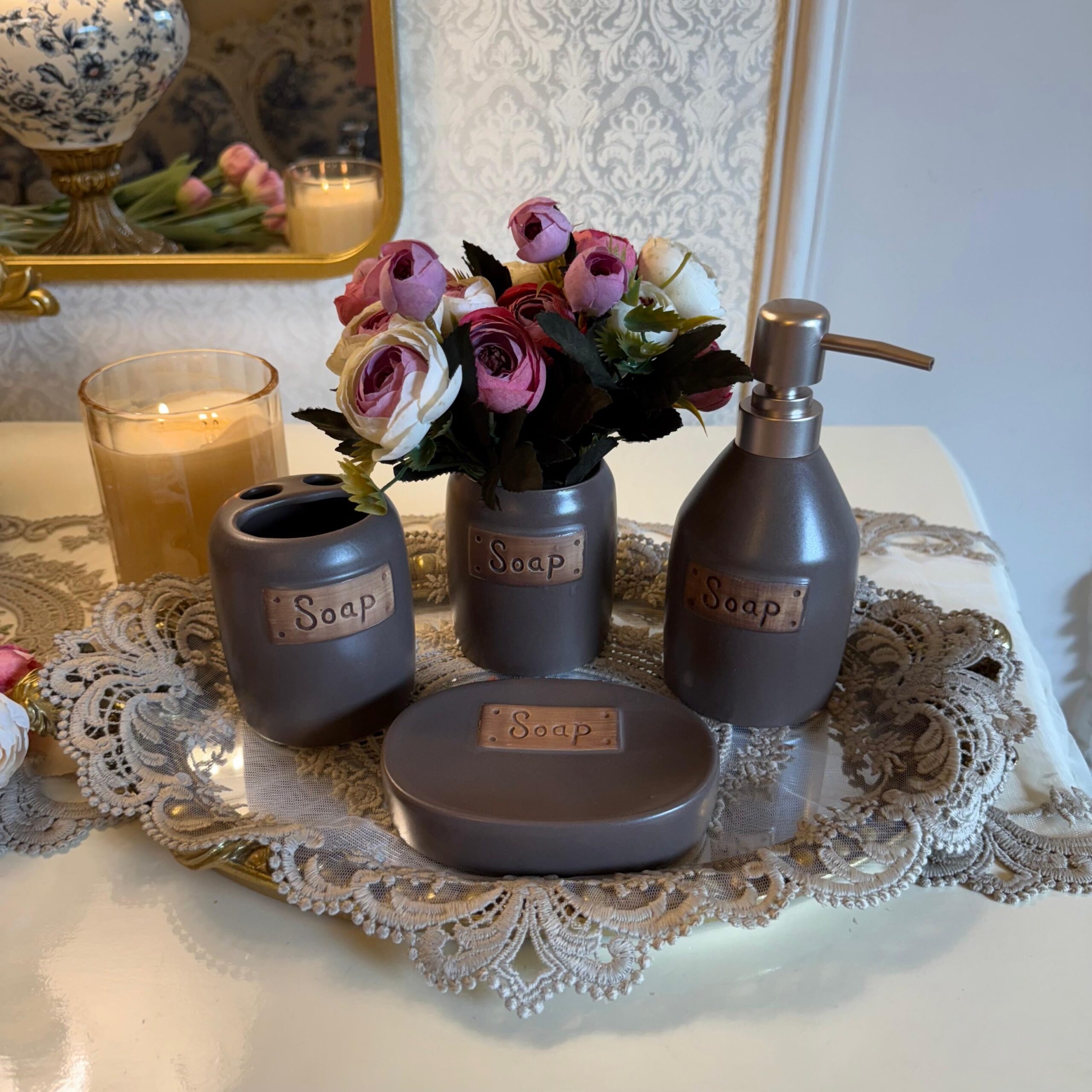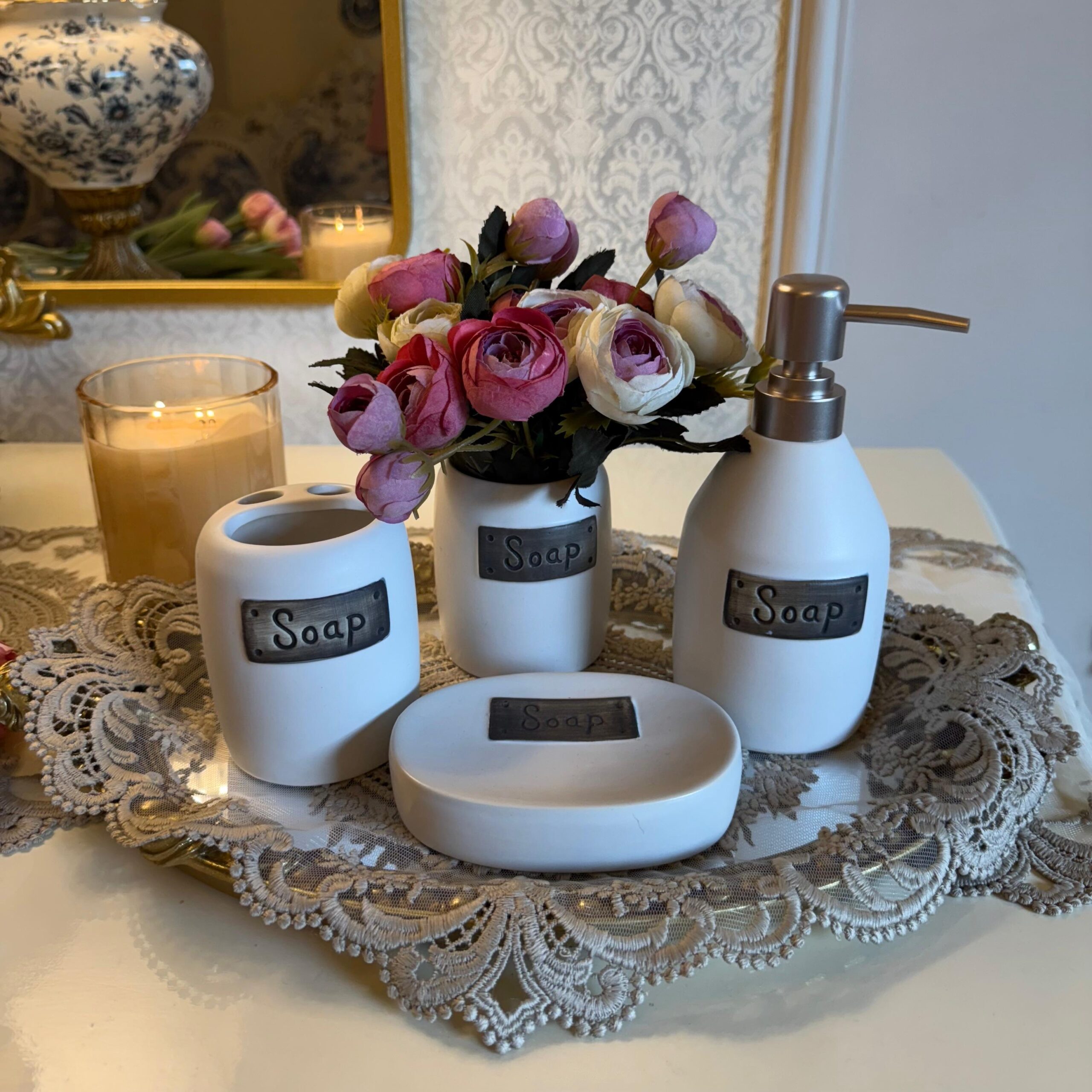 DESCRIPTION: The Aurelia Bath Ensemble brings refined elegance and modern simplicity to your daily rituals. This 4-piece set includes a soap case, tumbler, lotion dispenser, and brush holder — all crafted with clean aesthetics and premium quality. Functional yet stylish, it elevates your bathroom space with a touch of timeless luxury, making it the perfect blend of practicality and sophistication.