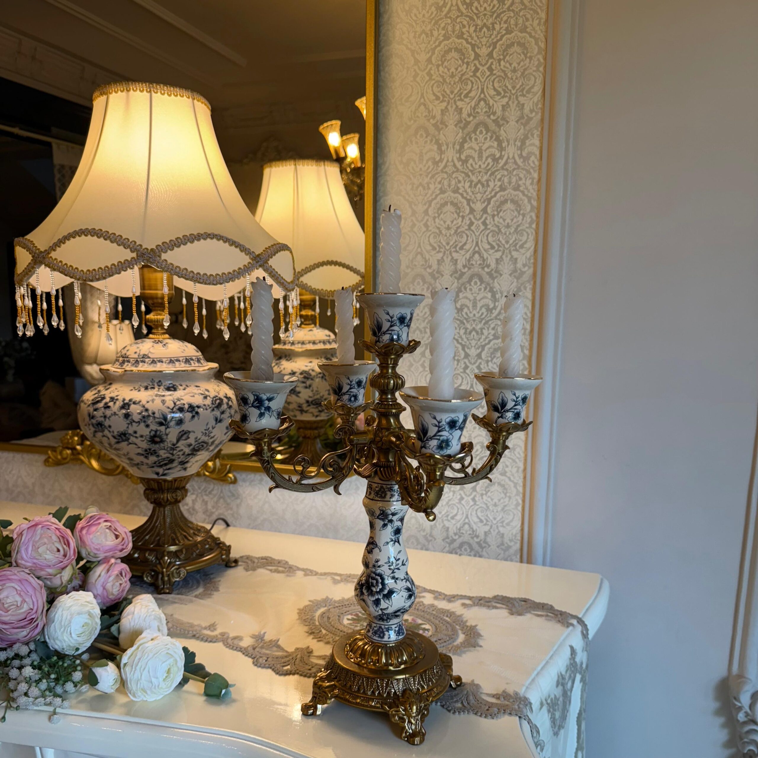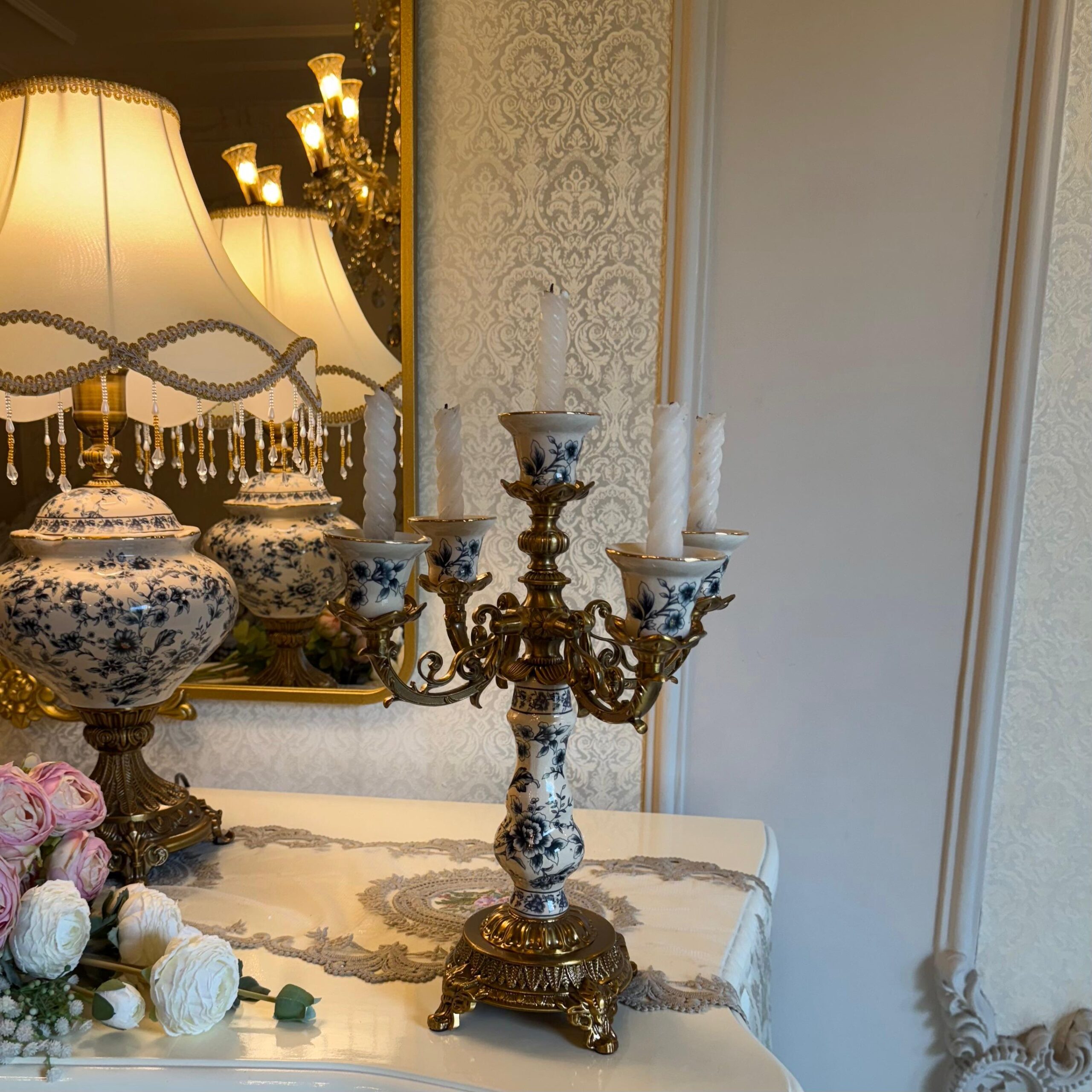 DESCRIPTION: The Bleu Héritage 5-Arm Candelabra is a magnificent centerpiece of timeless elegance. Crafted with high-quality materials, it features classic blue and ivory accents enriched with antique gold detailing. Its five gracefully arched arms hold candles in perfect symmetry, creating a warm, regal glow. Ideal for your dining table, mantelpiece, or decorative display, this candelabra brings sophistication and grandeur to any setting and pairs beautifully with the full Bleu Héritage collection.