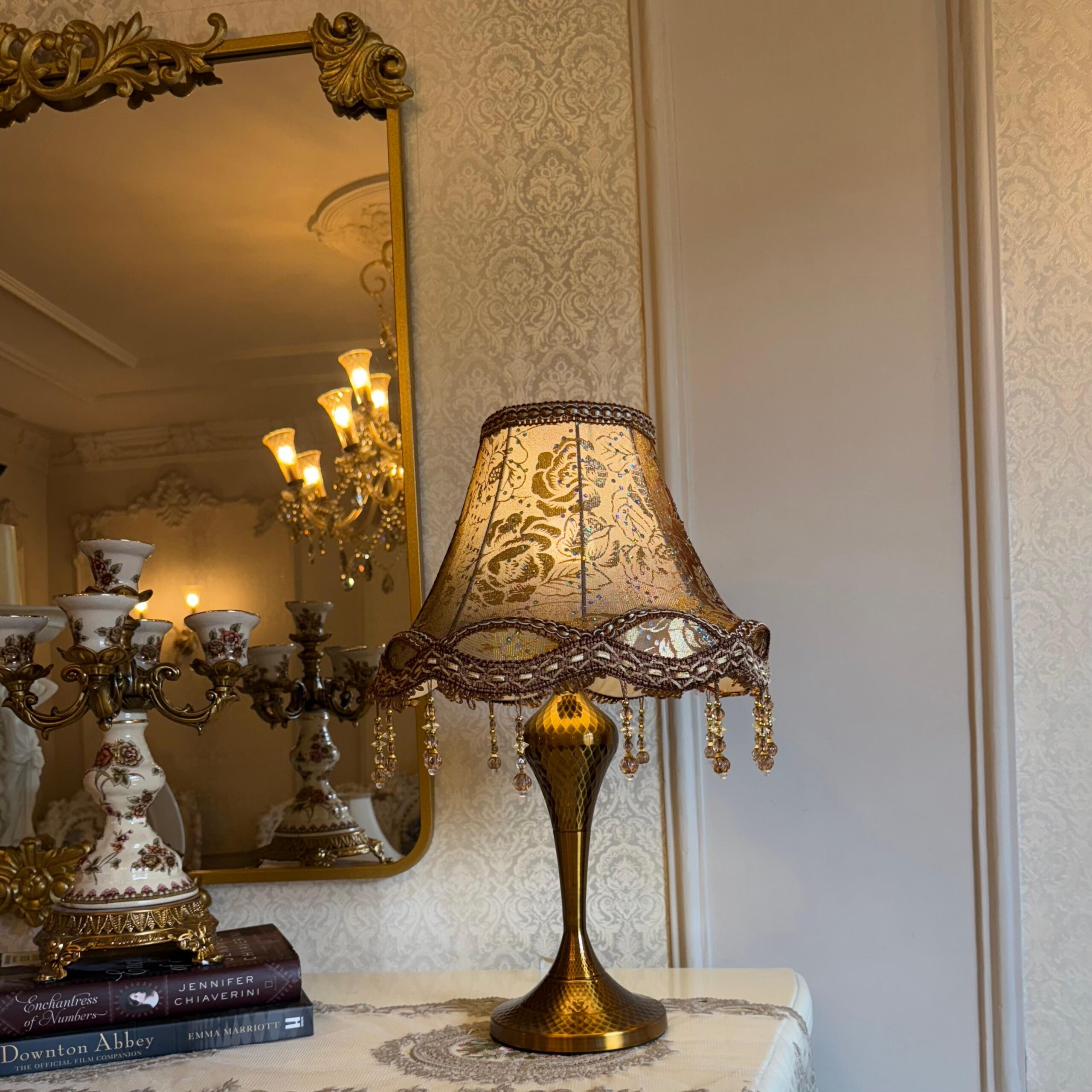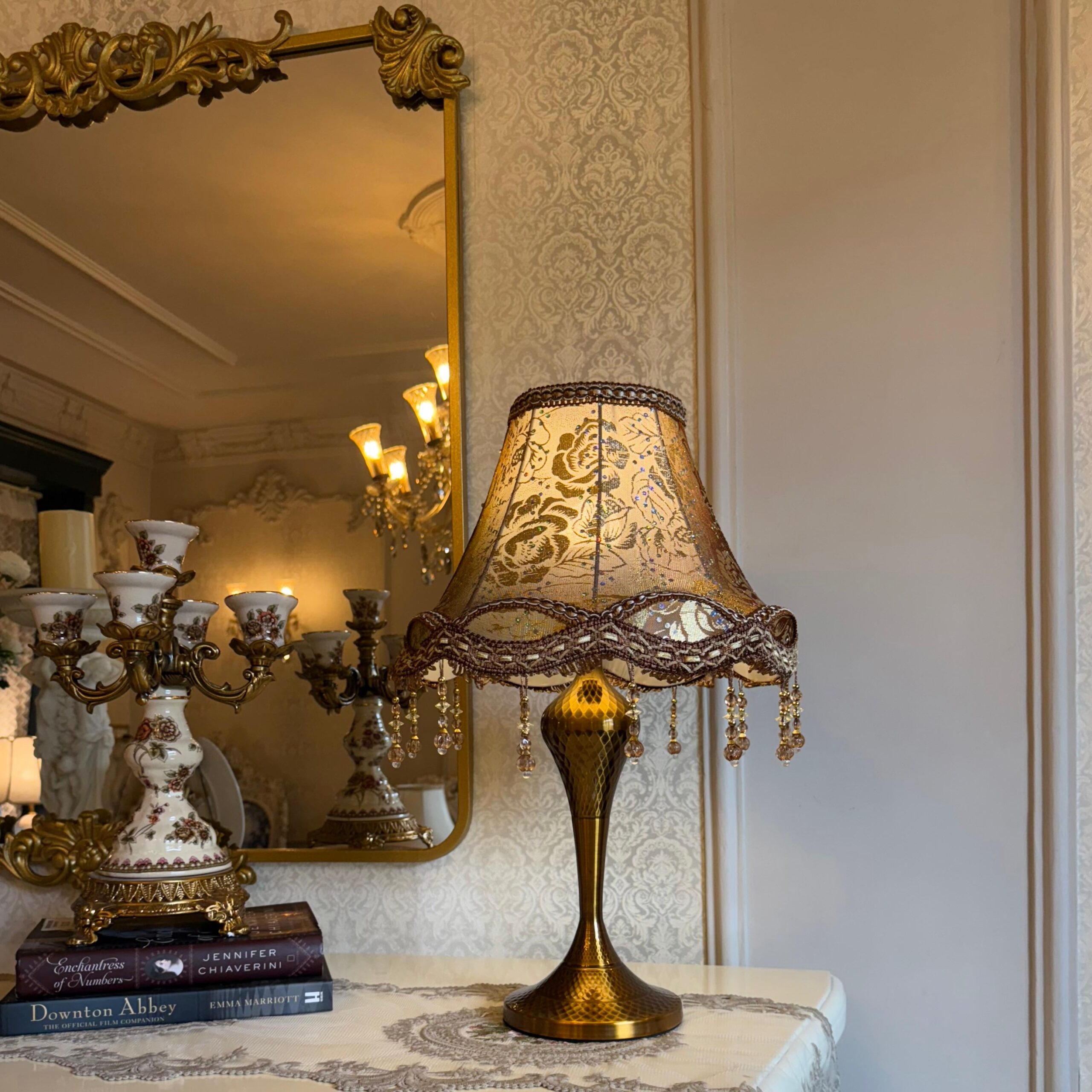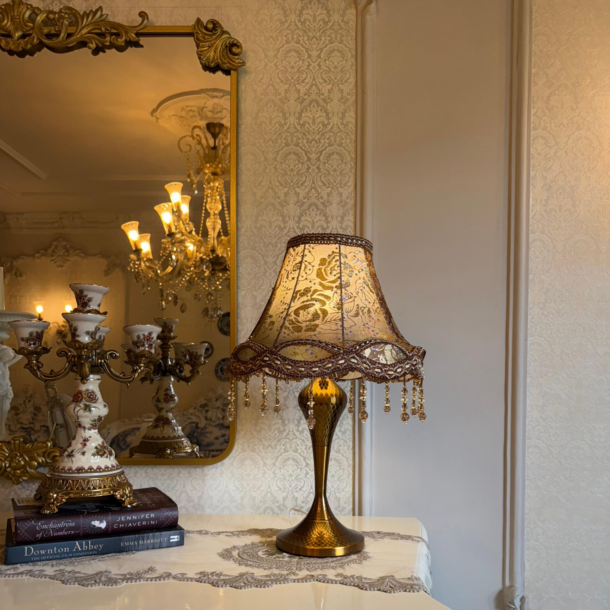 • DESCRIPTION:  The Café de Lumière Lamp exudes timeless European elegance with a warm, vintage touch. Featuring a coffee-colored lace shade adorned with delicate beaded tassels and a sturdy metallic base, it combines practicality with beauty. Ideal for desks, side tables, or bedside use, this lamp provides soft ambient lighting while enhancing any interior with its sophisticated, classic charm.