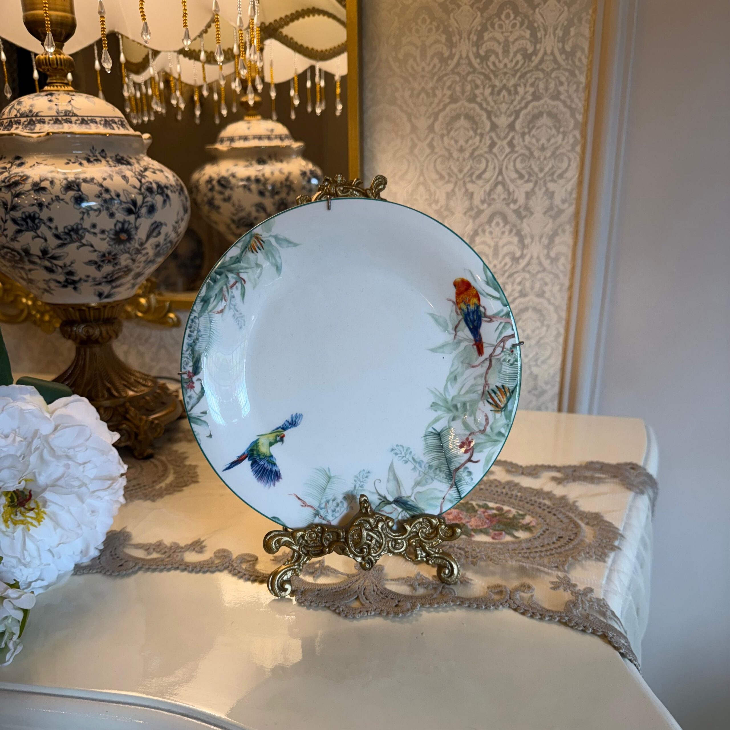 DESCRIPTION: The “Chelsea Bird Plate” is a masterpiece of high-grade bone china, elegantly adorned with a sophisticated bird and jungle theme. The exquisite design features a harmonious blend of green and blue hues on a pristine white background. The plate reflects a balance of nature and elegance, making each dining experience a visual delight. Elevate your table setting with the timeless charm and superior craftsmanship of the Chelsea Bird Dinner Plate, a true symbol of refined dining.