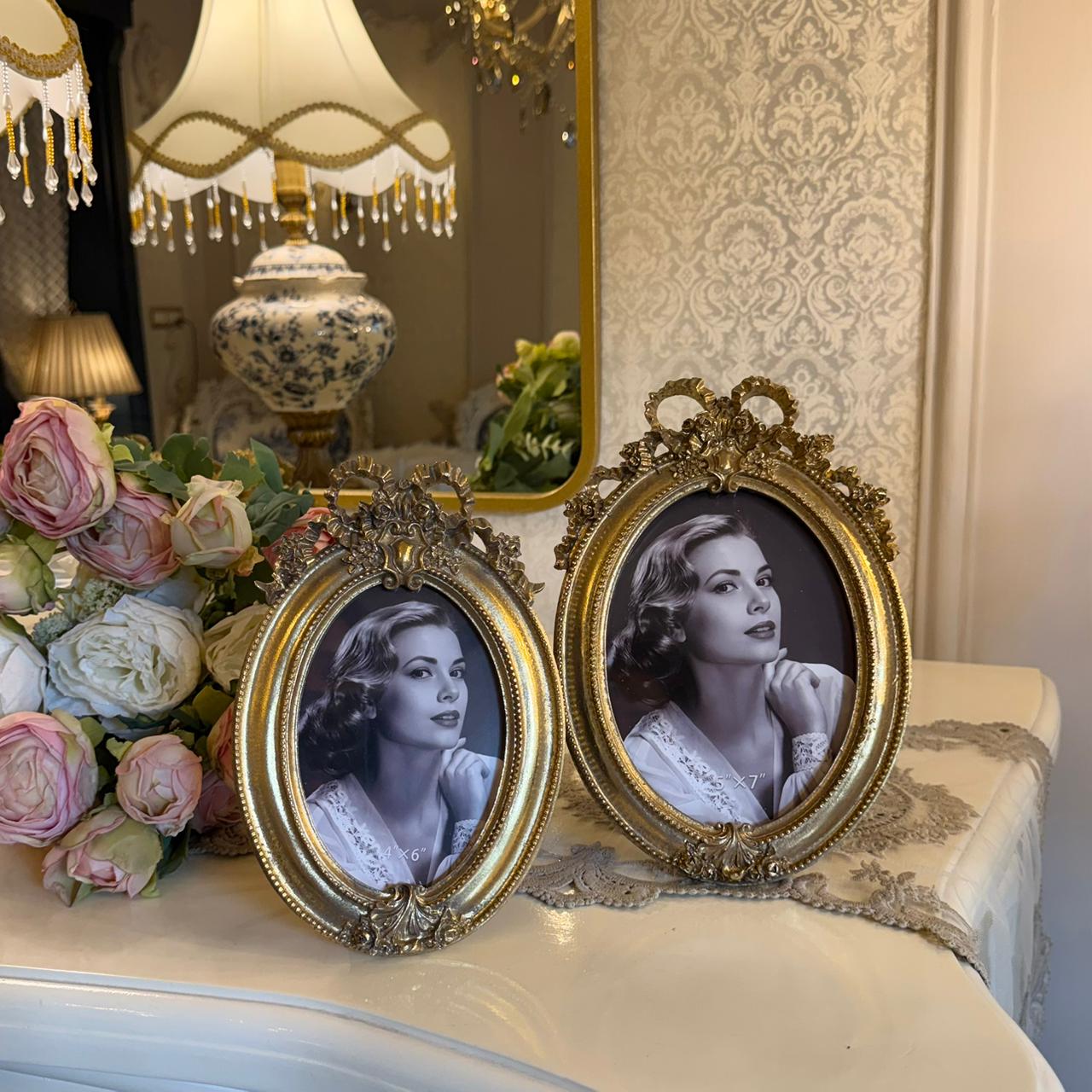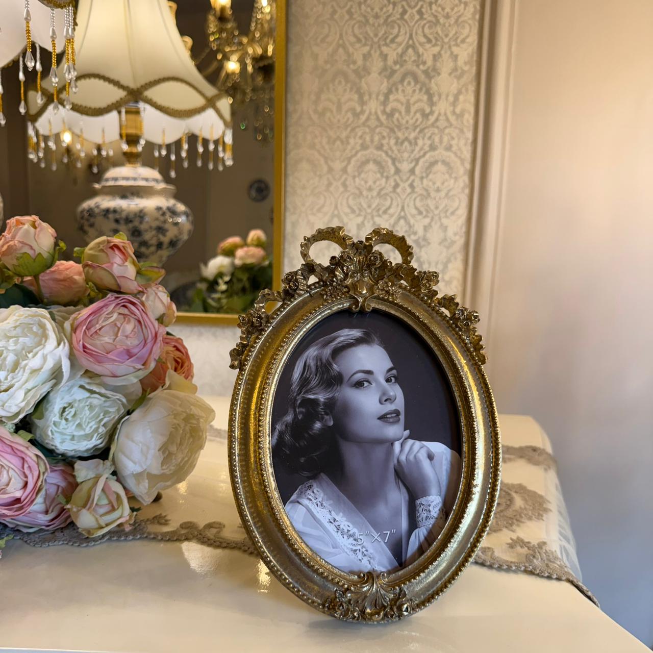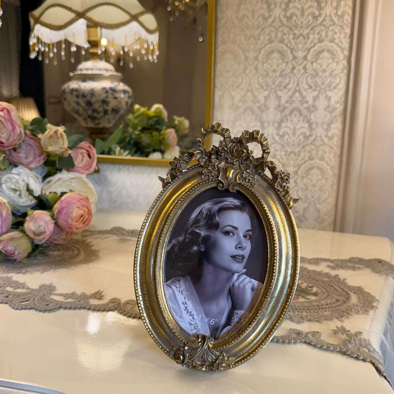 DESCRIPTION:Graceful and romantic, the Chérie Bow Frame captures the delicate charm of classic French-inspired décor. Featuring an elegant bow detail and refined ornamental accents, this beautiful picture frame brings a soft, feminine touch to your interior styling.Finished in a vintage antique tone, the frame creates a lovely setting for cherished photographs, portraits, or small art prints. Its timeless design makes it perfect for decorating vanities, bedside tables, consoles, or shelves, adding a hint of Parisian elegance to your space. Inspired by the sweetness of treasured keepsakes and vintage heirlooms, the Chérie Bow Frame blends beauty and sentiment, turning every photograph into a special memory.