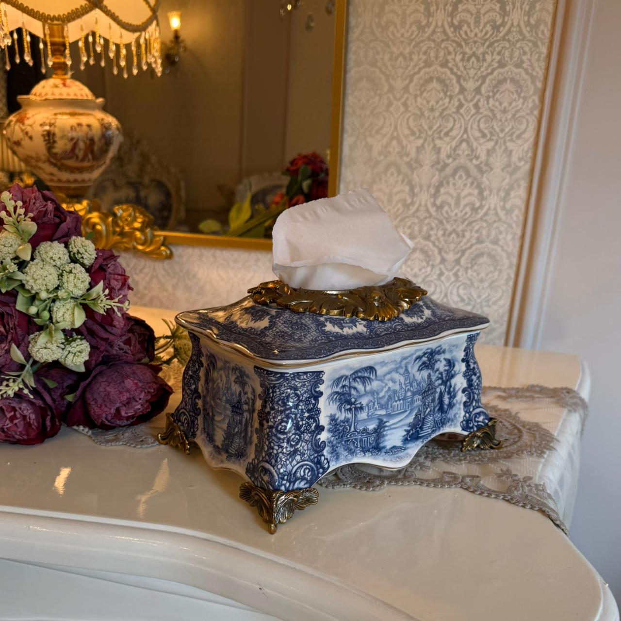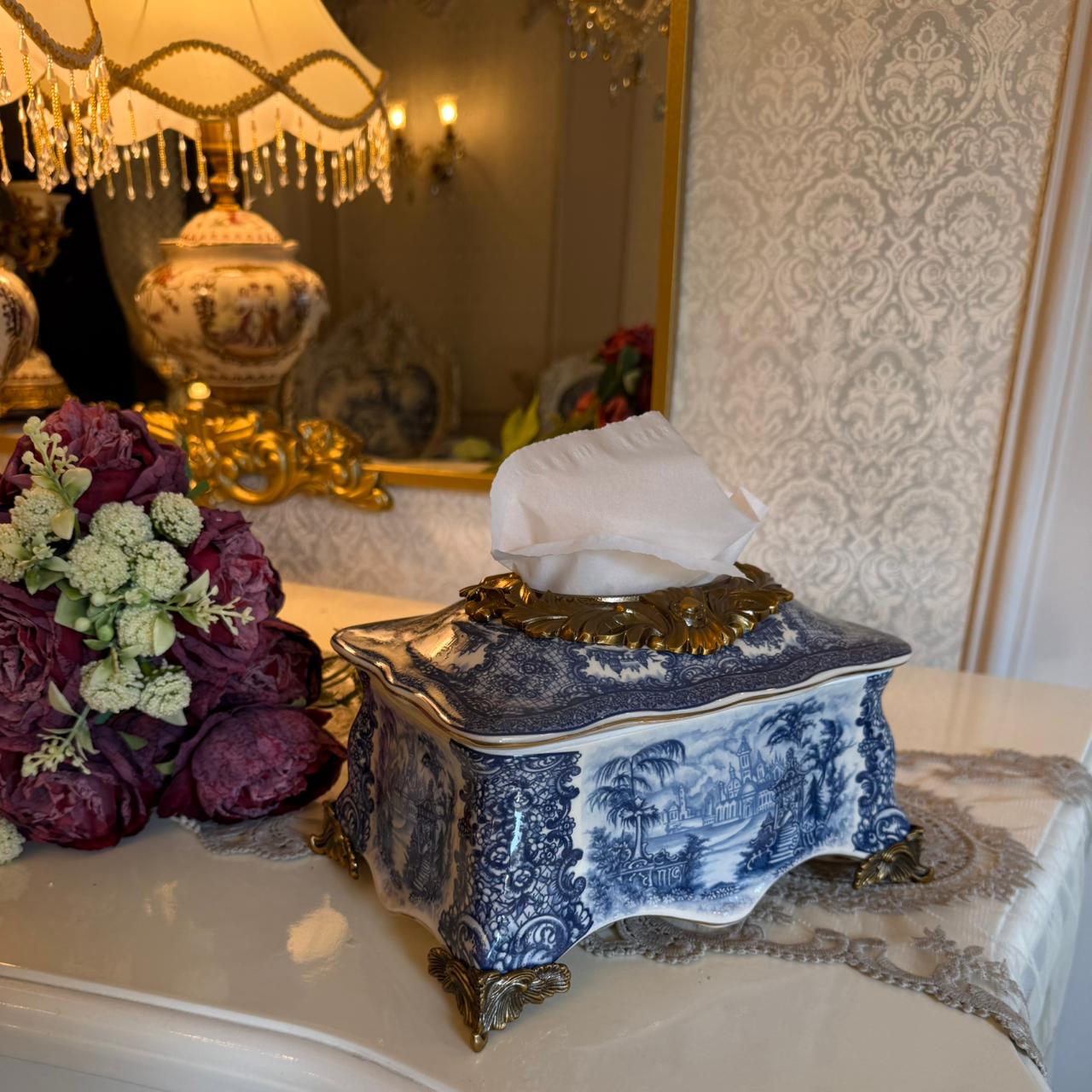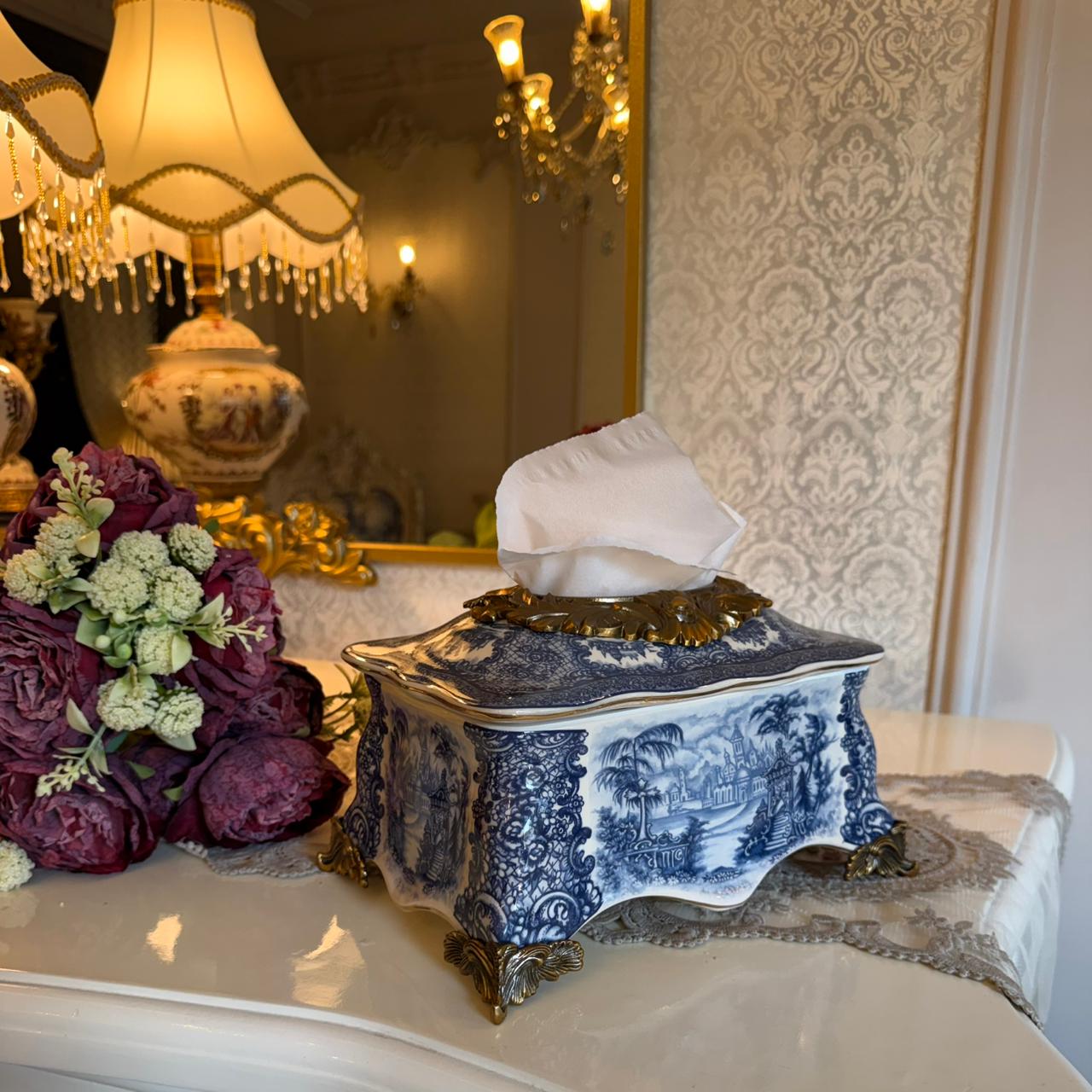 • DESCRIPTION: Crafted from high-grade ceramic and finished with delicate metal accents, this classic Staffordshire tissue holder features a timeless blue and white palette with an intricately detailed old English village scene. Inspired by traditional English pottery, its scenic artwork reflects countryside charm and heritage craftsmanship. The smooth glazed surface and well-balanced proportions make it both a functional accessory and a refined decorative accent for living spaces, bedrooms, or dining areas. Perfect for interiors that embrace vintage elegance, colonial style, or classic European décor, this tissue holder adds character, depth, and understated sophistication to any setting.