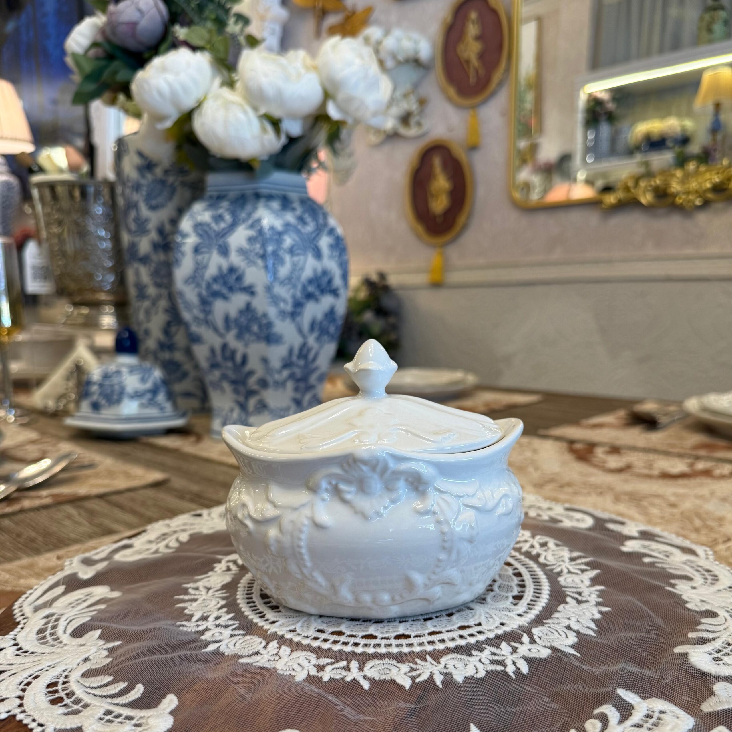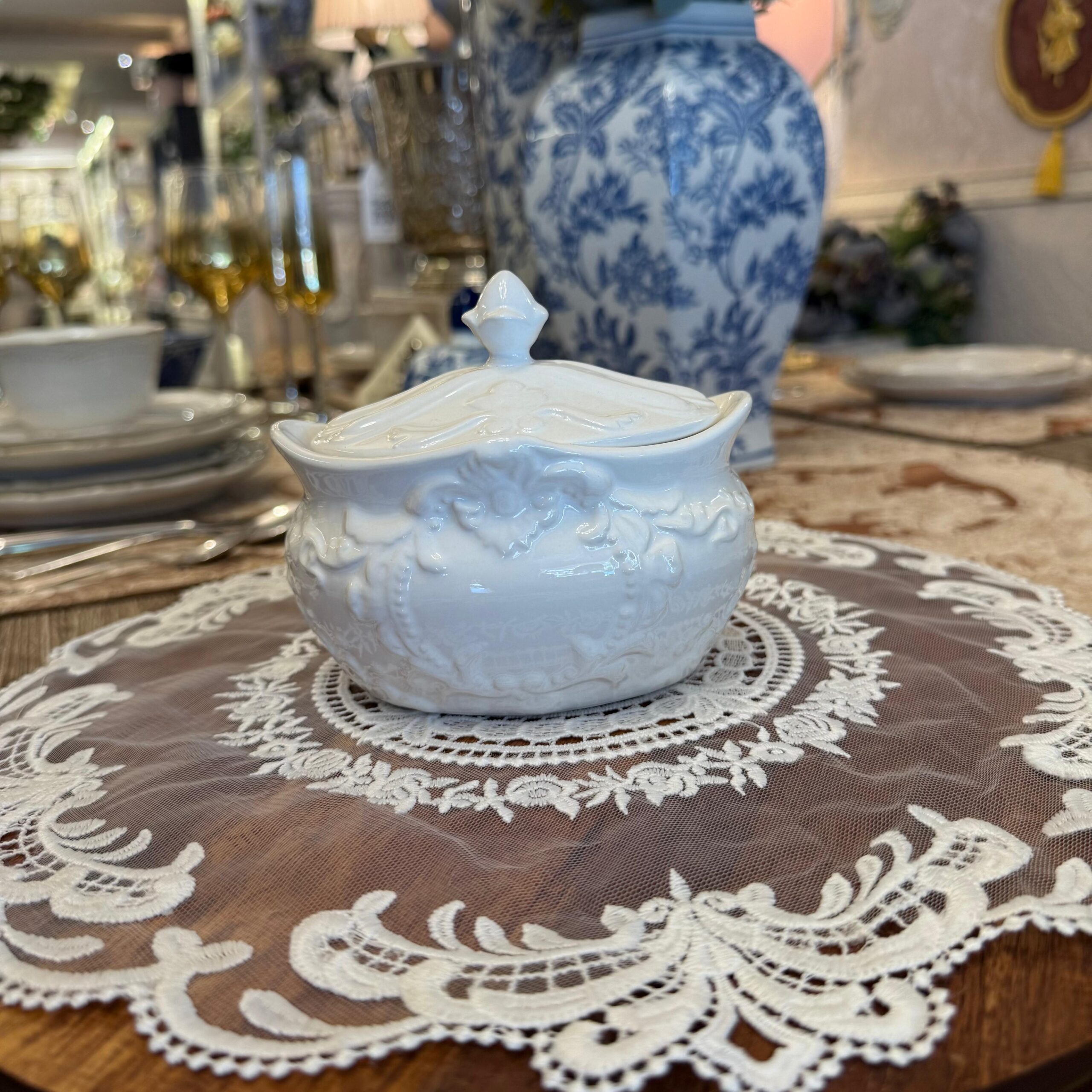 DESCRIPTION: Introducing the “French Riviera Fable” Tureen, a versatile and exquisite addition to your tableware collection. This multipurpose tureen, in a refined ivory color, boasts deep embossing with intricate French-style details, elevating your dining experience. Perfect for serving sauce, dips, stews, or as a stunning centerpiece, this tureen embodies timeless elegance, capturing the essence of the French Riviera in every detail.