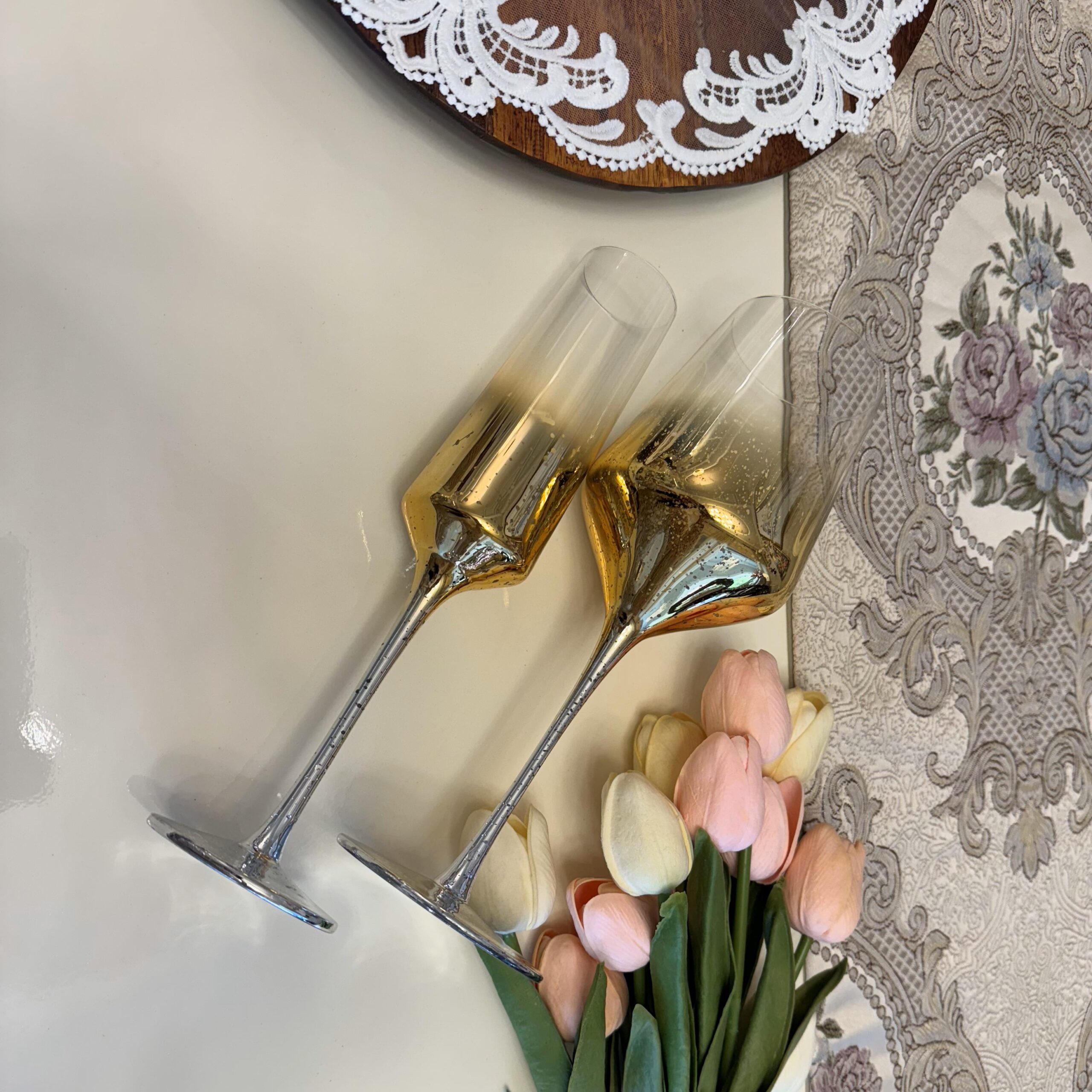 DESCRIPTION: Indulge in the opulence of our Gold Luster Champagne Glasses. Crafted with precision, each glass features a radiant gold luster finish that elegantly dances with light, adding a touch of glamour to your drinking experience. The stem is gracefully adorned with intricate gold details, elevating the overall aesthetic. Sip your favorite Champagnes in style, as these glasses seamlessly blend luxury and functionality, making every moment a celebration.