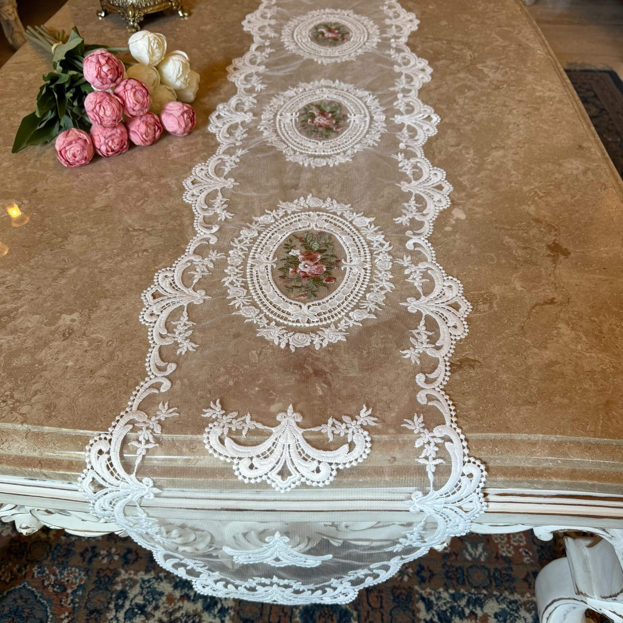DESCRIPTION: The Scalloped Embroidered Table Runner, adorned with intricate French lace in a vintage-inspired design, is a poetic expression of timeless elegance. Crafted with meticulous attention to detail, this runner unfolds a story of sophistication and grace on your table. The scalloped edges delicately frame the piece, adding a touch of whimsy and refinement.