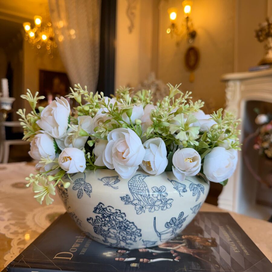• DESCRIPTION:A statement of quiet grandeur.This exquisite lidded urn carries the soul of classic Chinoiserie — where art, nature, and craftsmanship meet in perfect harmony. Its form is timeless, but what truly captivates is the story painted across its surface.Soft florals bloom across a canvas of ivory, blush, and deep cobalt — intertwined with delicate branches and perched birds that feel almost alive. The subtle crackle finish beneath adds depth and age, giving it that coveted heirloom character.