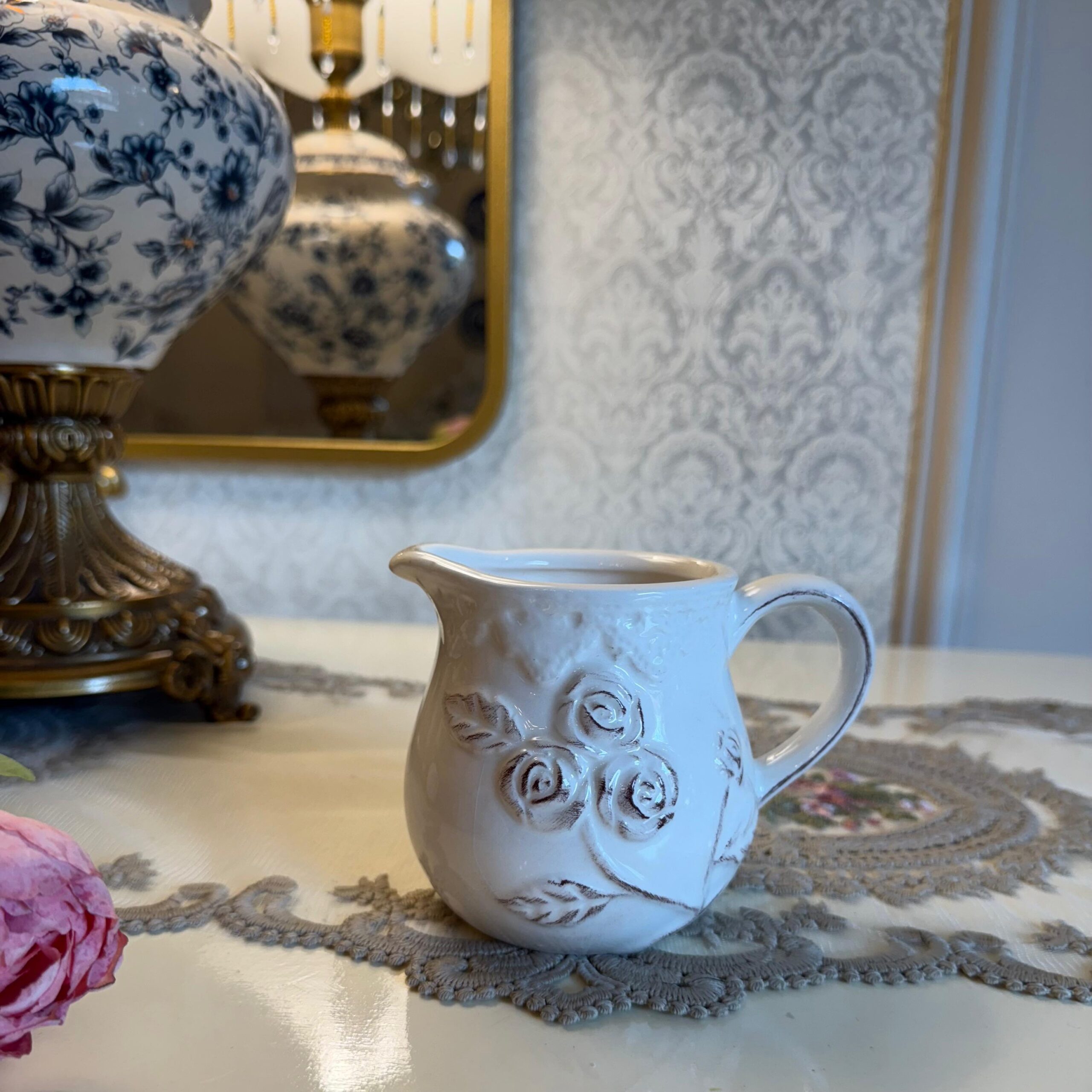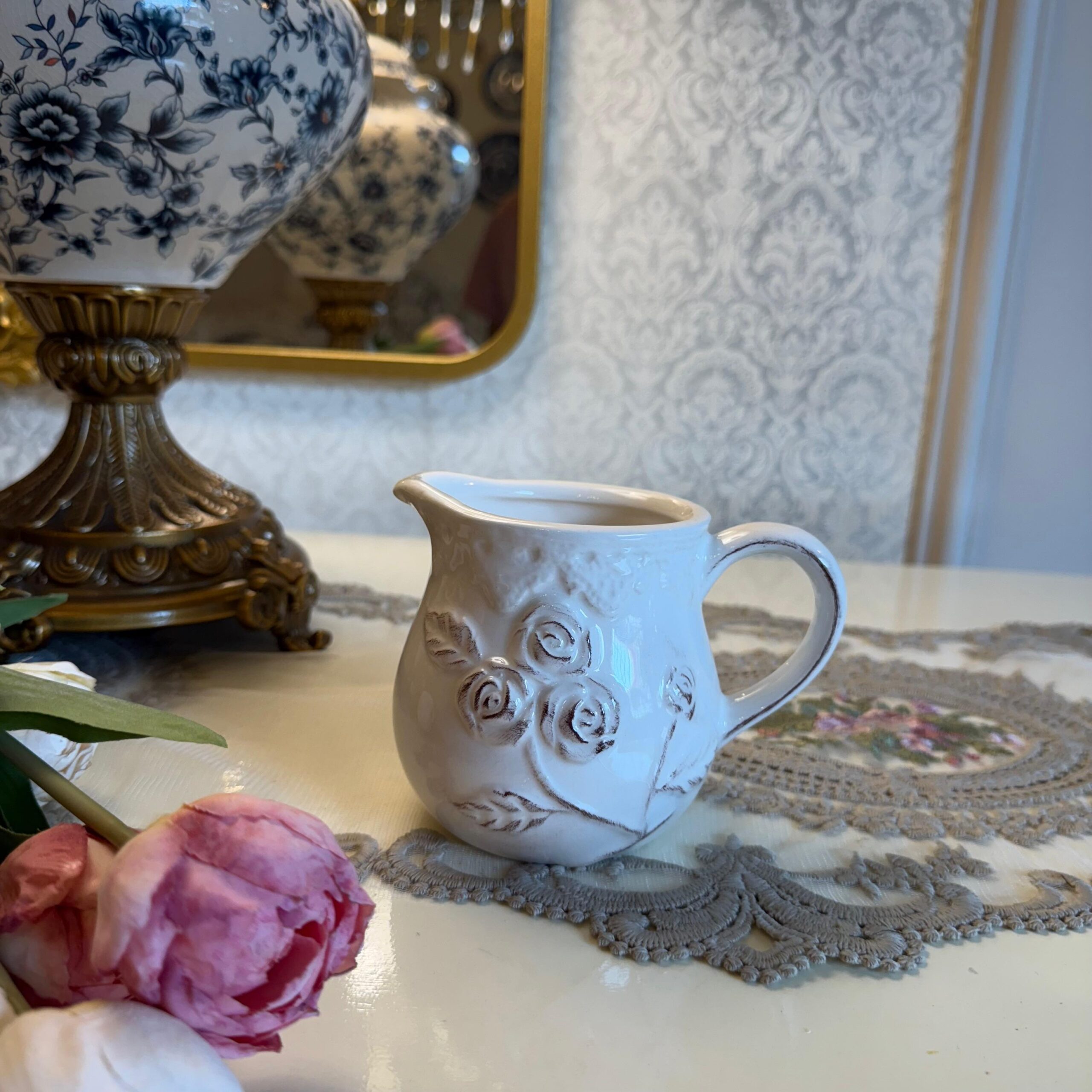 • DESCRIPTION:Delicate and timeless, the Petite Rose Cruche features embossed roses on a soft ceramic body, evoking French countryside charm. Though perfect for serving cream or milk, it also makes a lovely holder for syrup, sauces, fresh herbs, or even a mini floral arrangement. Use it for salad dressings, bedside water, single stems, or as a charming accent on your kitchen shelf.