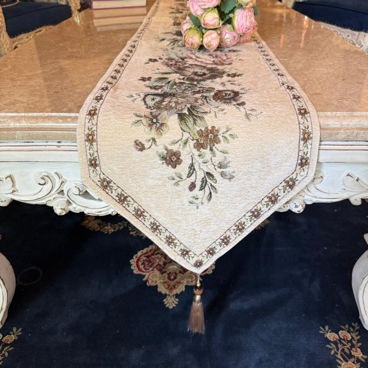 - DESCRIPTION: Table runner made from Italian fabric with a floral motif and high-quality fabric can add a touch of luxury and sophistication to your dining table. By incorporating these runners into your table, you can create an inviting and refined dining experience that reflects the beauty and elegance of Italian design.