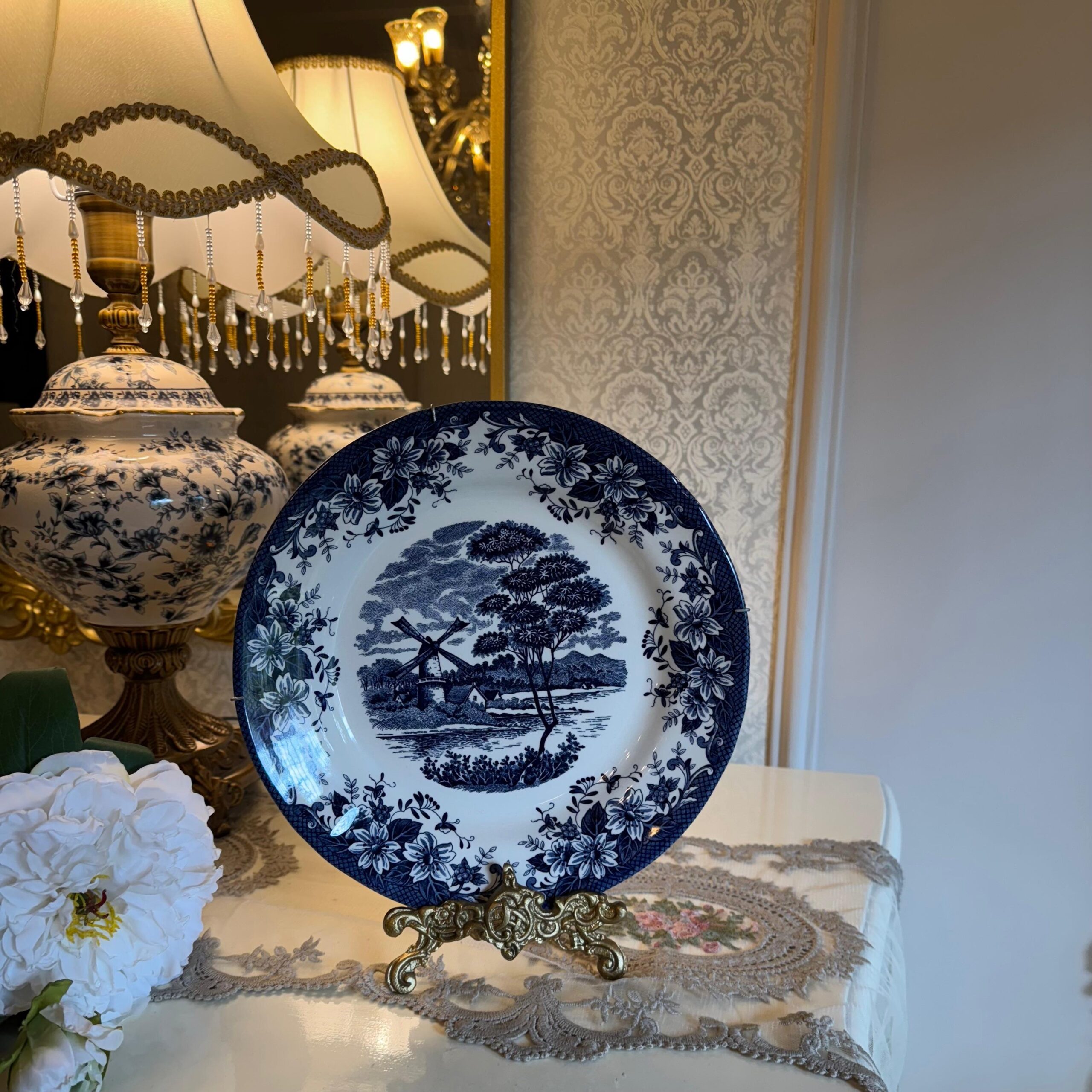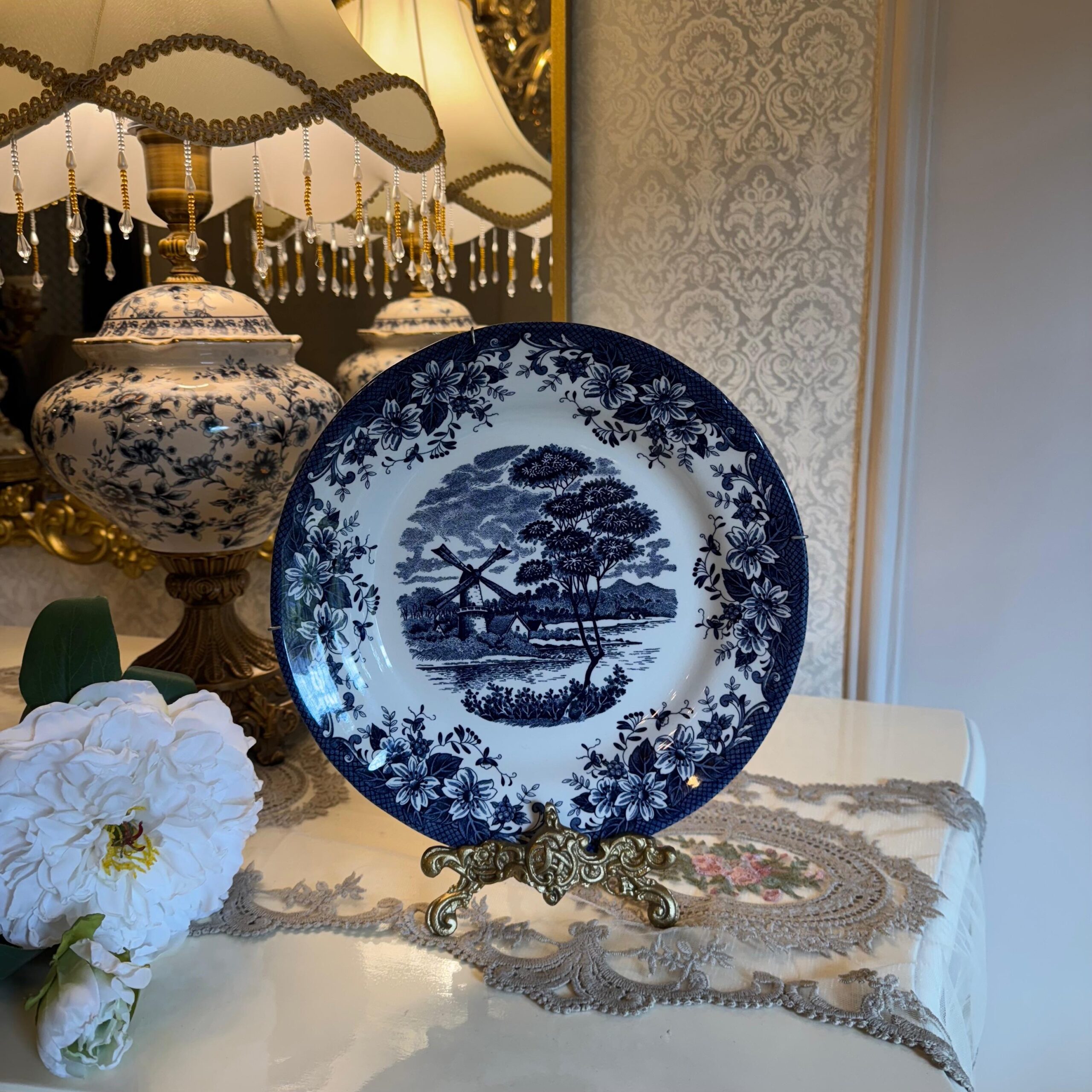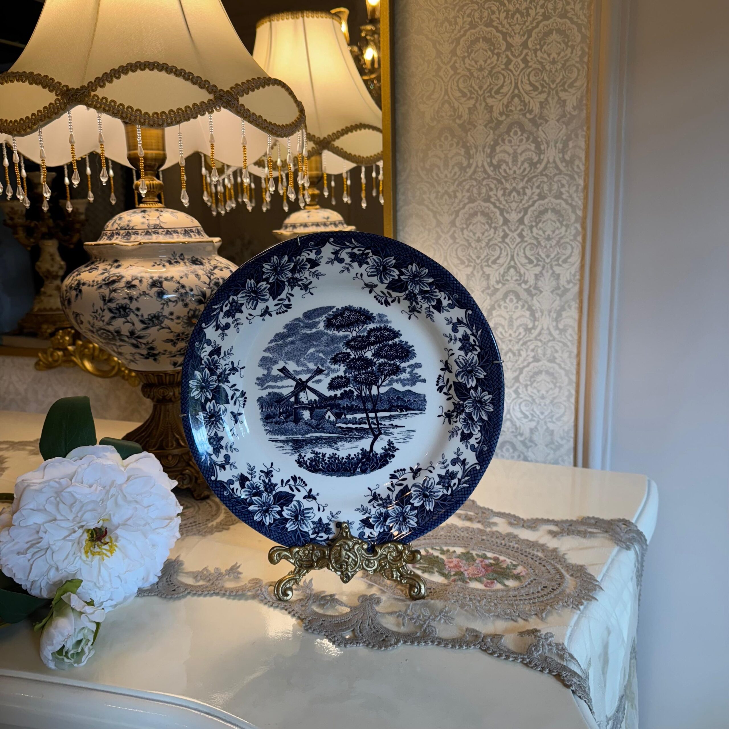 • Bring timeless European charm to your interiors with this exquisite Blue Willow–style decorative plate. Featuring a classic pastoral landscape with a traditional windmill motif at the center, the plate is beautifully framed by an intricate navy-blue floral border.The deep cobalt detailing against the crisp white base reflects old-world craftsmanship and makes this piece a perfect accent for console tables, cabinets, wall displays, or curated vintage décor settings. Whether styled on a stand or mounted on a wall, it adds a refined, heritage-inspired touch to any space.Ideal for collectors, classic home décor lovers, or as a thoughtful gift, this plate blends elegance, history, and artistry effortlessly.
