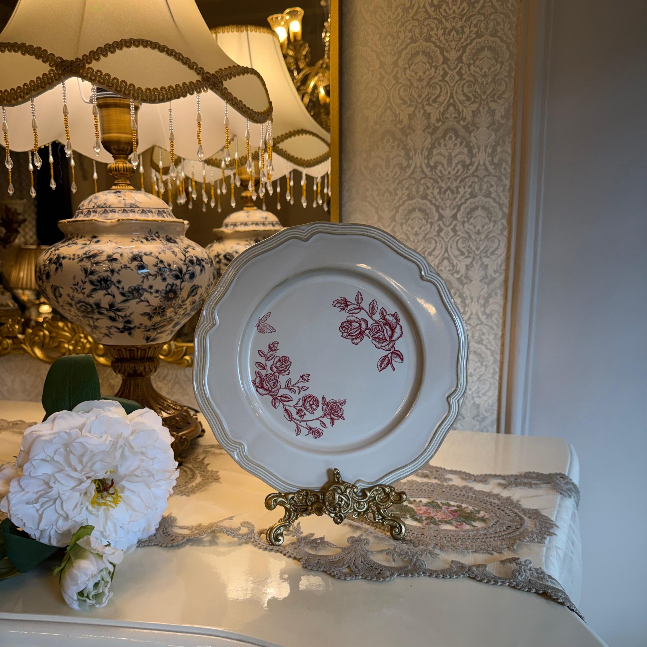 DESCRIPTION: The Vintage Rosé Dinner Set is a luxurious collection that embodies the timeless elegance of European design. Each piece is meticulously crafted from high-quality ceramic, featuring retro red rose patterns gracefully set against an ivory backdrop. The embossed borders add a touch of sophistication, enhancing the overall aesthetic appeal. This dinner set not only serves as functional tableware but also as a statement piece, bringing classic charm and refined beauty to any dining experience.