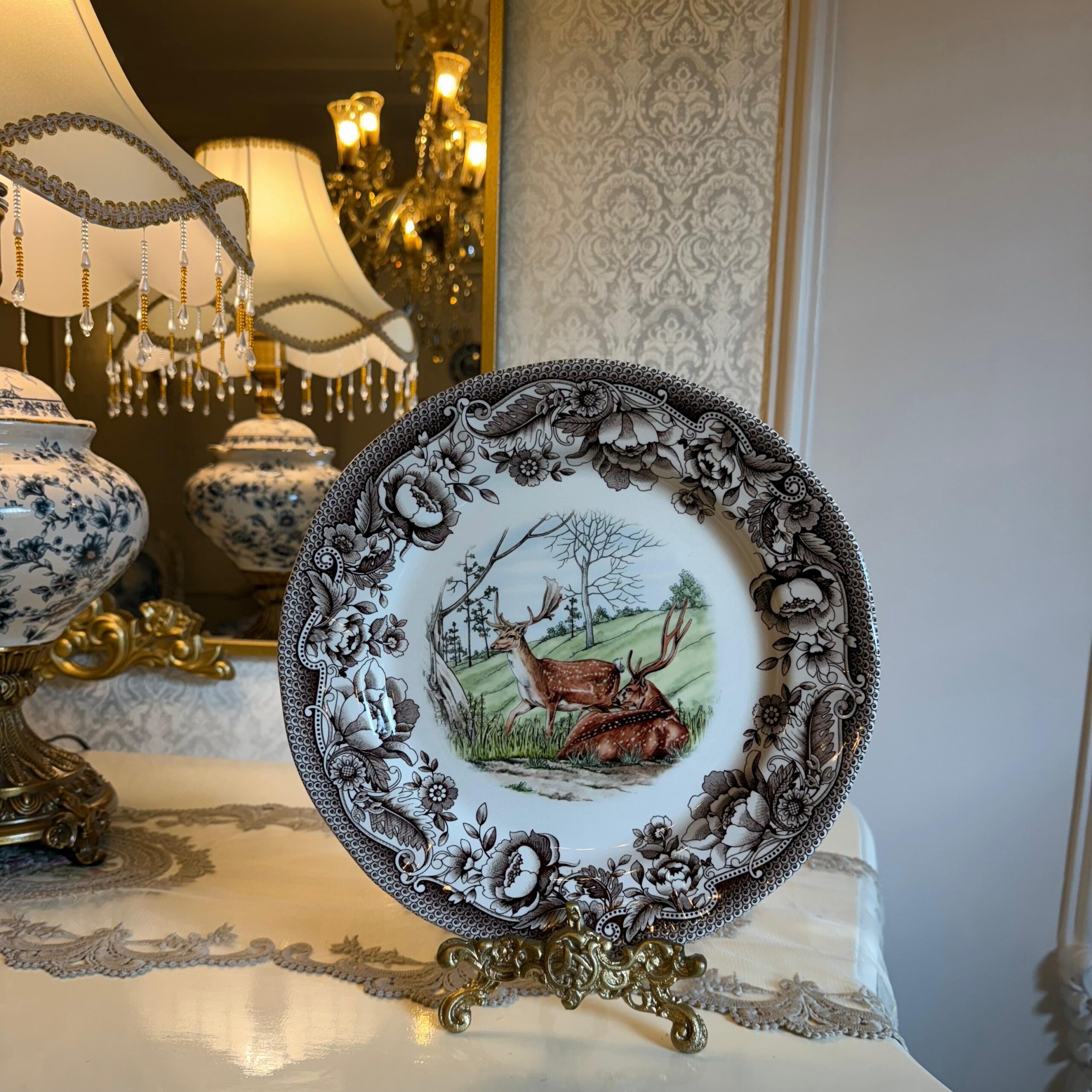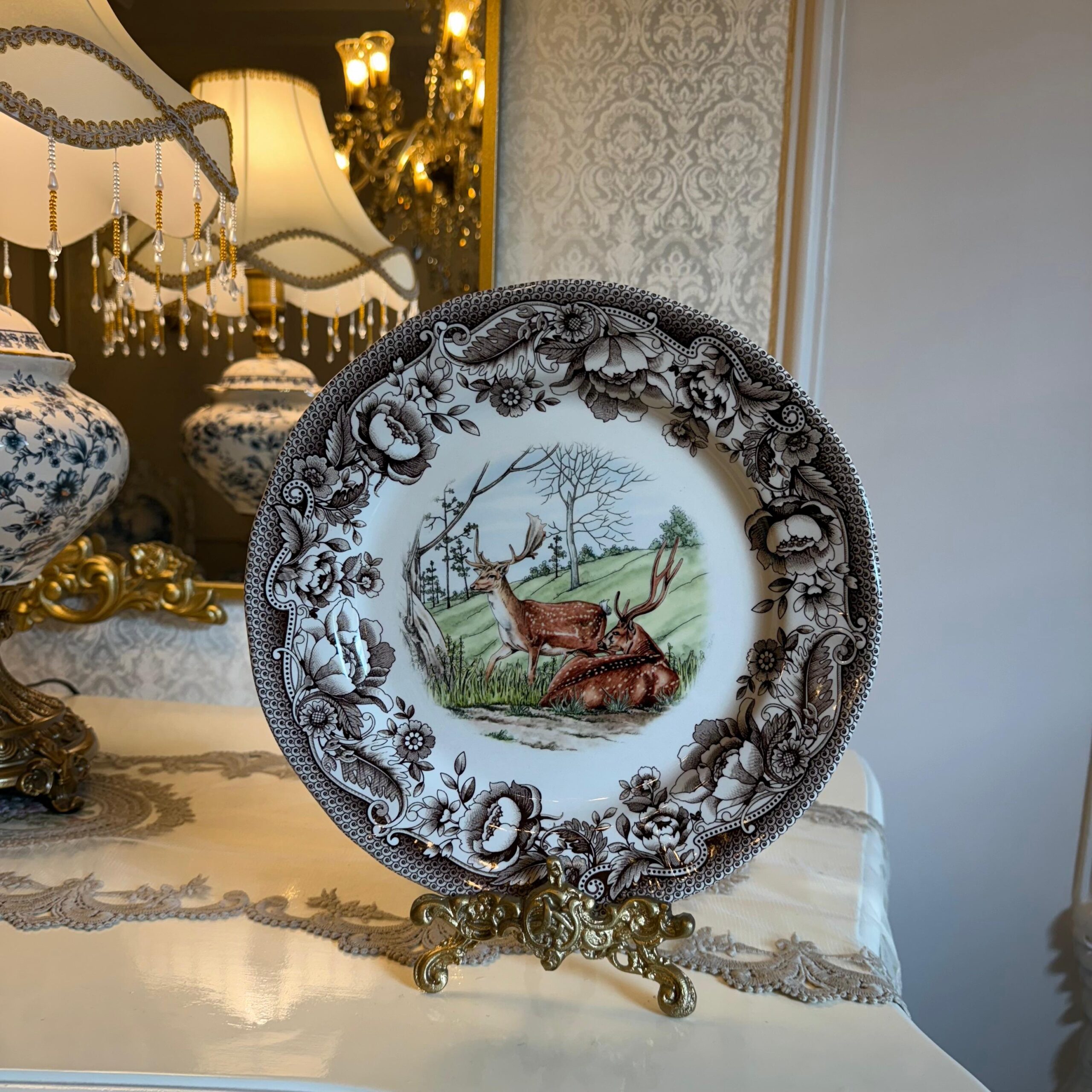 DESCRIPTION:A timeless Windsor-style plate featuring an elegant reindeer motif, detailed in classic artistry and rich seasonal charm. Whether displayed gracefully on your wall or used as a refined serving piece, this plate brings a touch of heritage beauty and festive nobility to your home.